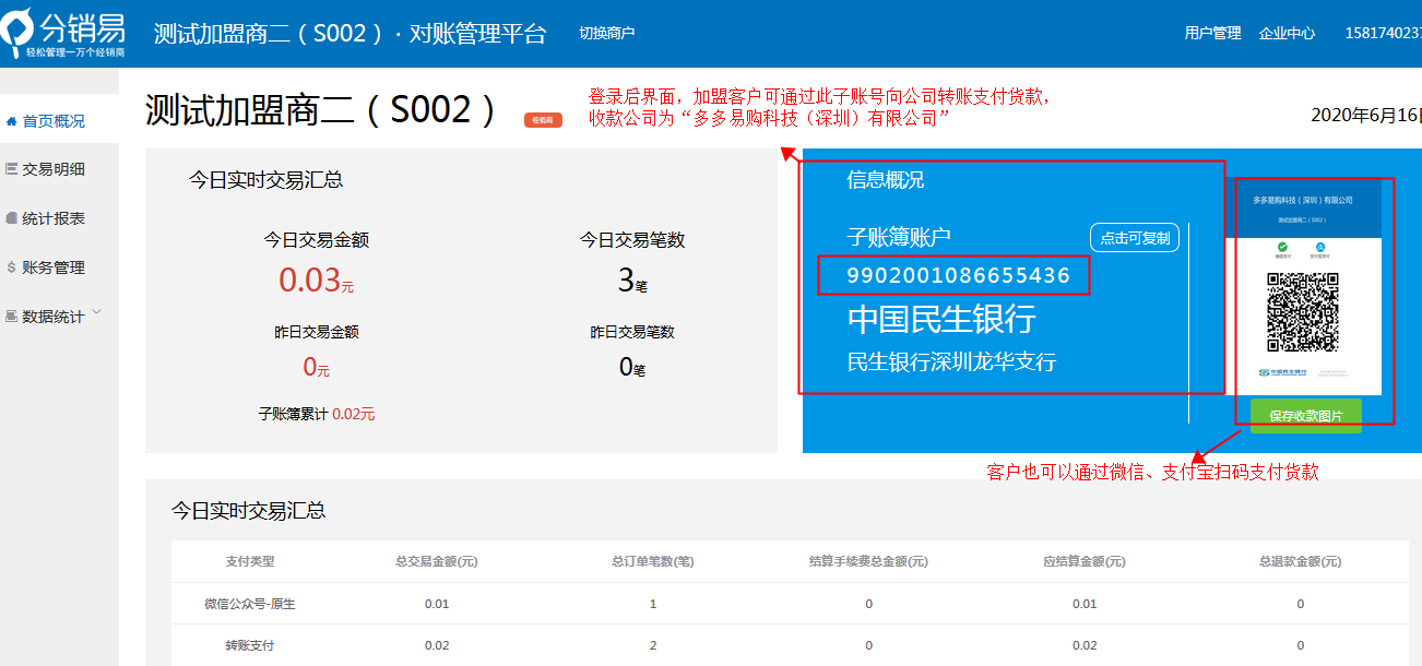 “分销易”用于加盟客户支付货款及查询、核对交易流水,通过2B平台“民生银行预下单支付”端口支付流水可同步到“分销易”账户,登录“分销易”账户通过银行转账、微信、支付宝等扫码支付的流水也能同步到2B平台,更方便简捷加盟客户支付货款明细查询.针对“分销易”账户流水的客户,民生银行可定向开放民生银行融资功能,解决加盟客户短期资金缺口问题。